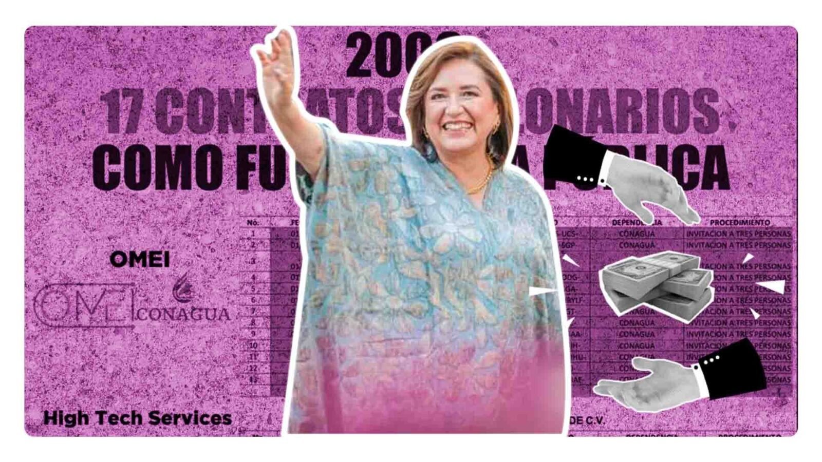 Desde un foro de los Estudios Churubusco, Sheinbaum expuso una lamina con los contratos que Xóchitl Galvez obtuvo entre la Comisión Nacional de Agua (Conagua) y sus empresas Operación y Mantenimiento de Edifición Inteligentes (OMEI) y High Tech Services. El monto total asignado fue por más de 285 millones de pesos.