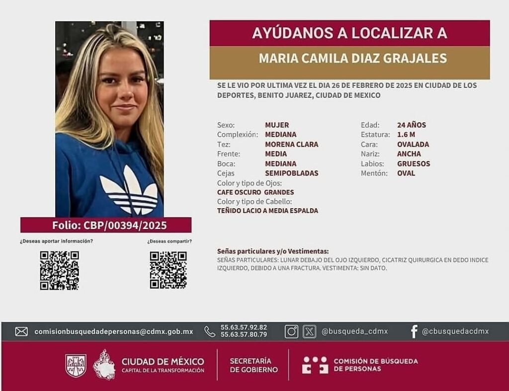 La familia de María Camila DÍaz llama a las autoridades mexicanas federales de CDMX realicen las investigaciones correspondientes y con prontitud; «por favor la localicen».