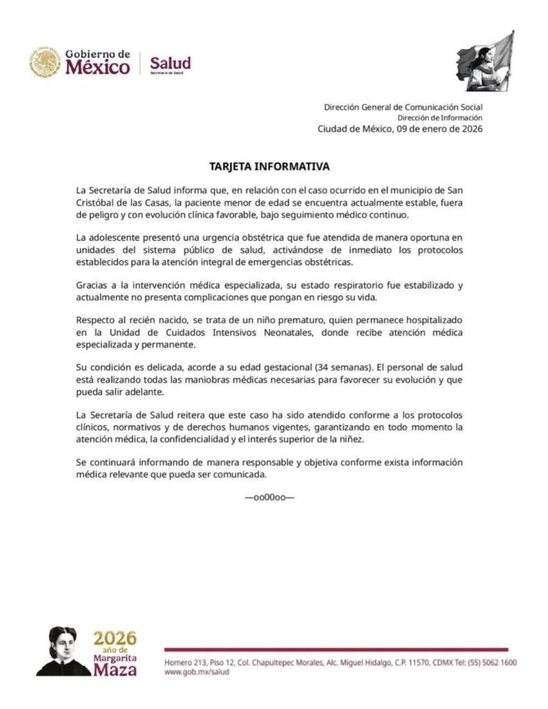Por separado, la Fiscalía General del Estado de Chiapas informó que tanto la madre como el recién nacido se encuentran estables y fuera de peligro, luego de haber presentado complicaciones derivadas de un contagio de sarampión, situación que motivó su traslado al Hospital de las Culturas.