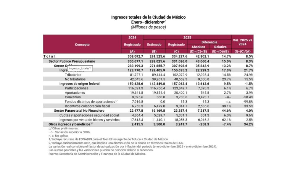 El informe detalla que para el cuarto trimestre de 2025, los ingresos totales ascendieron a 334, 327.6 millones de pesos, lo que representa un crecimiento anual de 8.5% y superior en 14.7% respecto a lo aprobado en la Ley de Ingresos de la Ciudad de México para el ejercicio fiscal 2025.