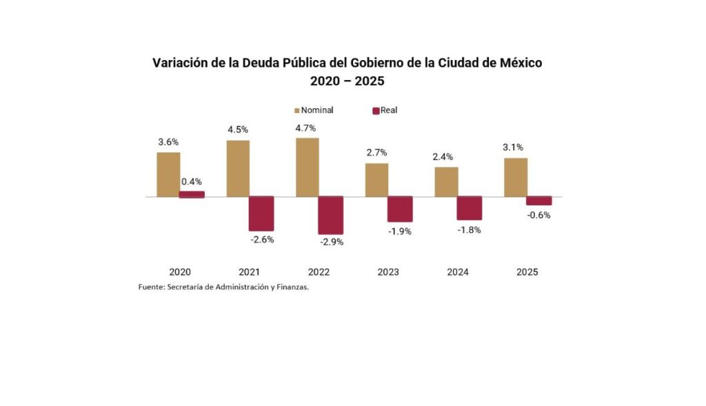 Para el cierre de 2025, el saldo de la deuda pública del Gobierno de la Ciudad de México se situó en 107, 263.6 millones de pesos, lo que representa un desendeudamiento real de 0.6% con respecto al de 2024.