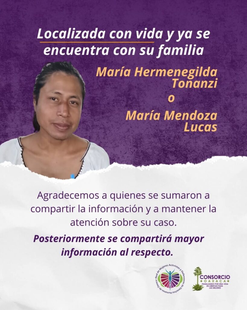 Aunque hasta el momento no se han dado detalles sobre las circunstancias de su localización, organizaciones refirieron que María Hermenegilda Tonanzi ya se encuentra en resguardo de sus familiares.