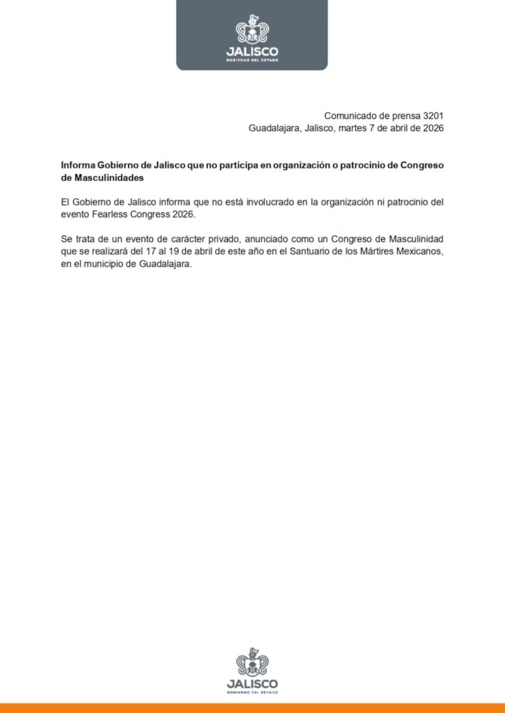 ”El gobierno de Jalisco informa que no está involucrado en la organización ni patrocinio del evento Fearless Congress 2026”.