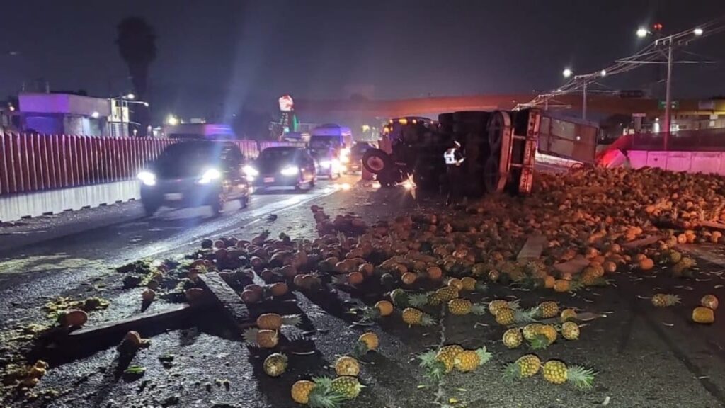 El hecho se dio luego de que un camión que cargaba piñas se volteara en los carriles centrales de la vialidad, lo que genera tráfico hacia la Ciudad de México.
