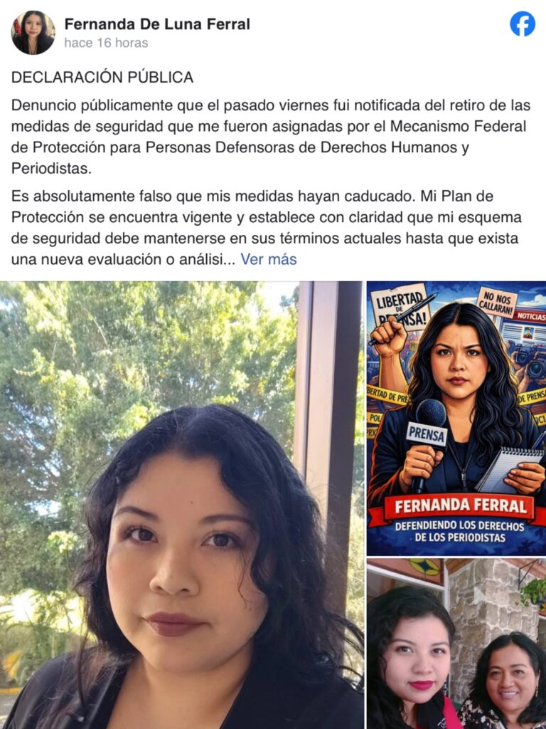 ”Mi nivel de riesgo está catalogado como ALTO. Soy víctima indirecta en el proceso penal por el asesinato de mi madre, la periodista María Elena Ferral. Dos personas ya fueron liberadas, el autor intelectual continúa prófugo y el proceso judicial sigue en distintas etapas. El riesgo no ha desaparecido”, indicó la comunicadora en una declaración pública difundida en redes sociales.