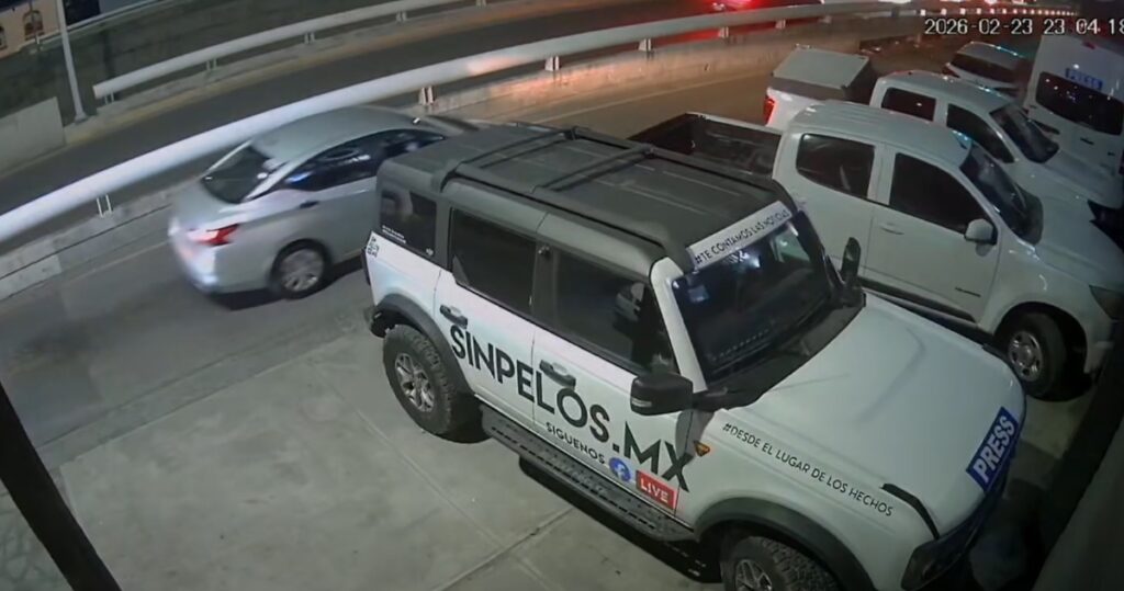 Al revisar las cámaras de seguridad se percataron que tres sujetos, dos abordo de un vehículo color plata con placas del Estado de México (Edomex) y otro más que viajaba en una motocicleta había estado merodeando las instalaciones, hasta que dos de ellos bajaron y lanzaron contra el estudio de grabación.