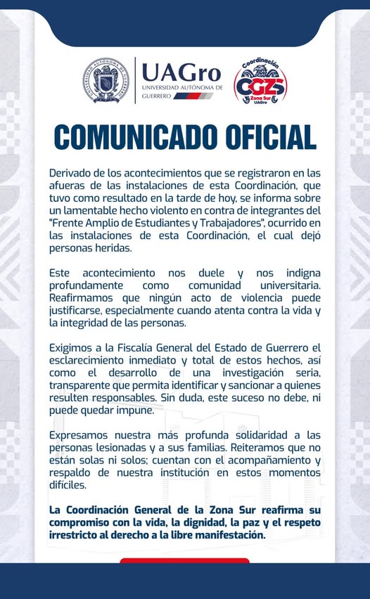 Tras el ataque, la Universidad Autónoma de Guerrero emitió un comunicado oficial en el que condenó «energéticamente» los hechos ocurridos a las afueras de las instalaciones de la Coordinación General de la Zona Sur y rechazó cualquier acto de violencia.
