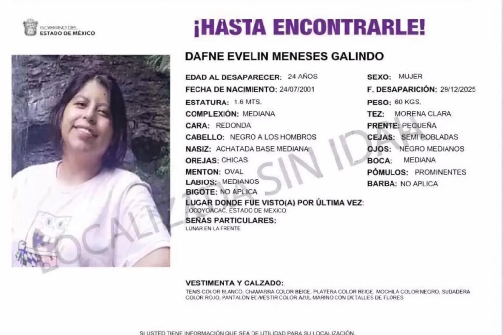 De acuerdo con la ficha de búsqueda emitida por las autoridades mexiquenses, Dafne Evelin fue vista por última vez el 29 de diciembre en el municipio de Ocoyoacac. Familiares refirieron que salió para encontrarse con su expareja, identificado como Yael Jacob.