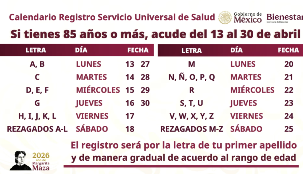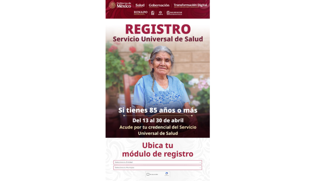 La Secretaria de Bienestar, Ariadna Montiel Reyes informó que el proceso de credencialización del Servicio Universal de Salud, iniciará con el registro de las personas de 85 años o más, a partir del lunes 13 al jueves 30 de abril. Este programa, explicó, permitirá que las mexicanas y mexicanos se atiendan en cualquiera de los tres sistemas de salud público IMSS, ISSSTE e IMSS Bienestar.