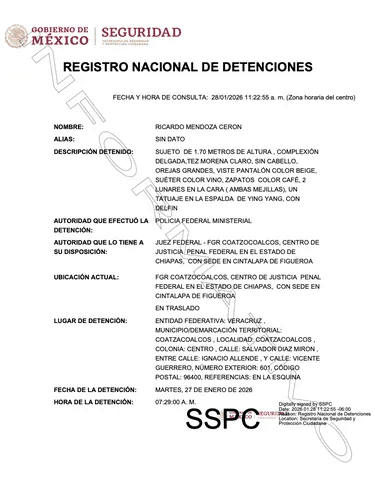 El lunes 26 de enero, elementos de la Agencia de Investigación Criminal (AIC) de la FGR cumplimentaron la orden de su captura en Coatzacoalco, Veracruz, y fue trasladado al Centro de Justicia Penal Federal con sede en Cintalapa, Chiapas.