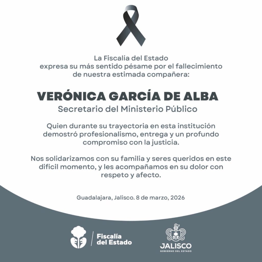 “La Fiscalía del Estado expresa su más sentido pésame por el fallecimiento de nuestra estimada compañera Verónica García de Alba, Secretario del Ministerio Público. Durante su trayectoria en esta institución demostró profesionalismo, entrega y un profundo compromiso con la justicia”, señaló la dependencia en la esquela.