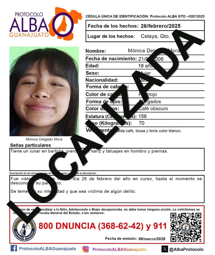 Las autoridades también confirmaron la localización de Amairani Fernanda Gutiérrez Olalde, de 29 años, desaparecida en Celaya el 3 de julio de 2024; Mónica Ramírez González, de 38 años, desaparecida en noviembre de 2023 en Villagrán; y Gloria de los Ángeles Guerrero Patiño, de 30 años, desaparecida en diciembre de 2025 en Cortazar.