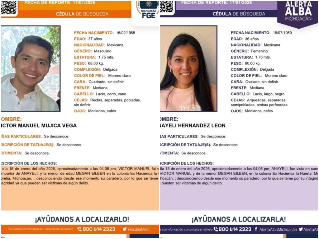 Víctor Manuel y Anayeli fueron vistos por última vez con su hija menor de edad en la colonia exhacienda de la Huerta, en Morelia, a las 16:06 horas.