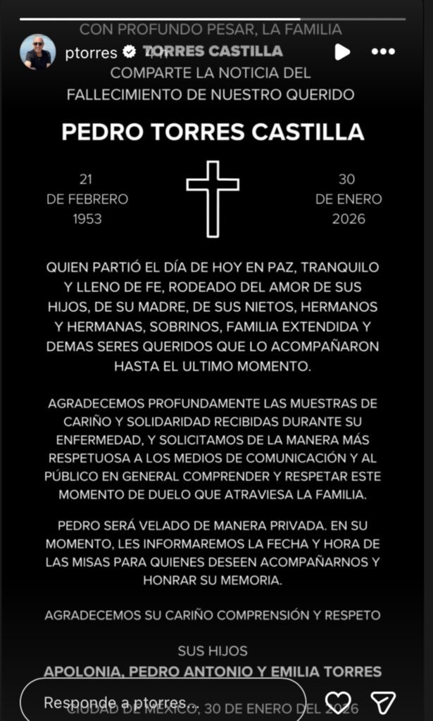 “Con profundo pesar, la familia Torres Castilla comparte la noticia del fallecimiento de nuestro querido Pedro Torres Castilla, quien partió el día de hoy, tranquilo, en paz y lleno de fe, rodeado del amor de sus hijos, de su madre, de sus nietos, hermanos y hermanas, sobrinos y familia extendida, y demás seres queridos que lo acompañaron hasta el último momento”.