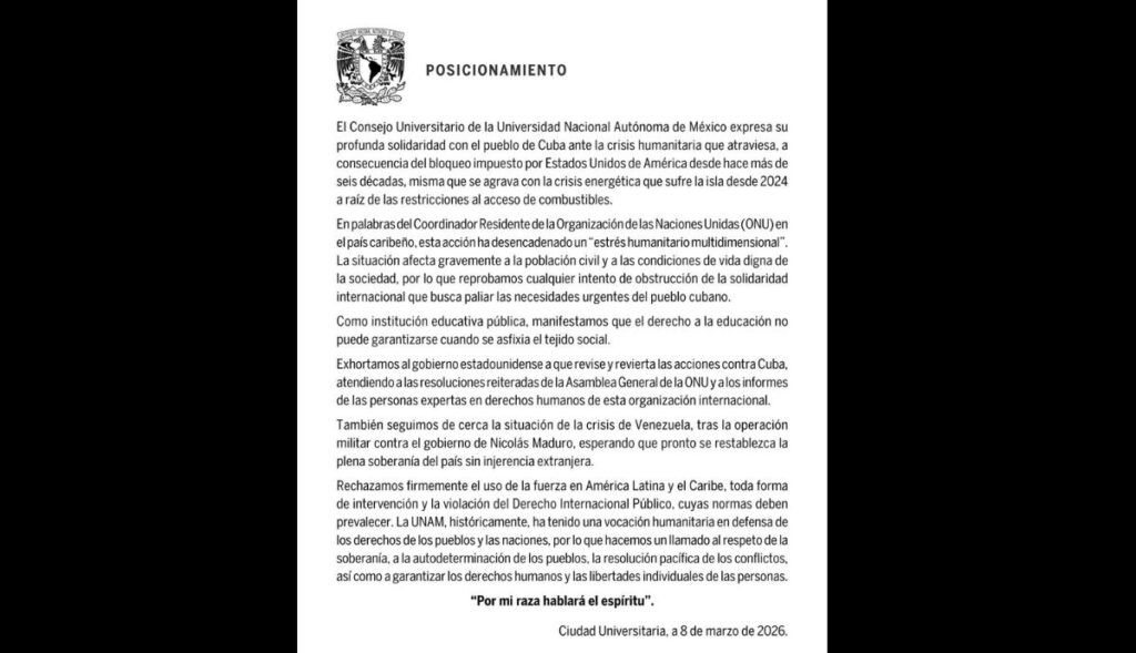 «El Consejo Universitario de la Universidad Nacional Autónoma de México expresa su profunda solidaridad con el pueblo de Cuba ante la crisis humanitaria que atraviesa, a consecuencia del bloqueo impuesto por Estados Unidos de América desde hace más de seis décadas, misma que se agrava con la crisis energética que sufre la isla desde 2024 a raíz de las restricciones al acceso de combustibles», manifiesta el documento.