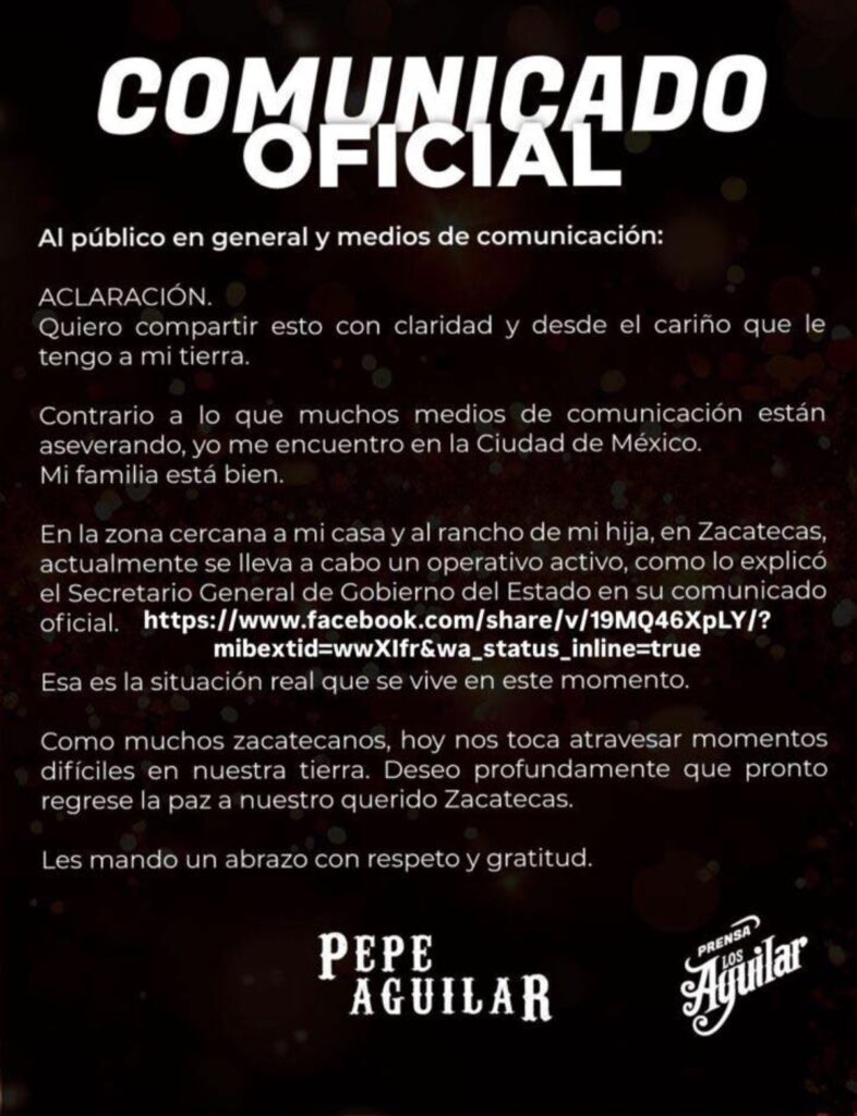 Tras difundirse versiones sobre un supuesto atentado en su contra, el cantante Pepe Aguilar publicó un comunicado en sus redes sociales para aclarar la situación: